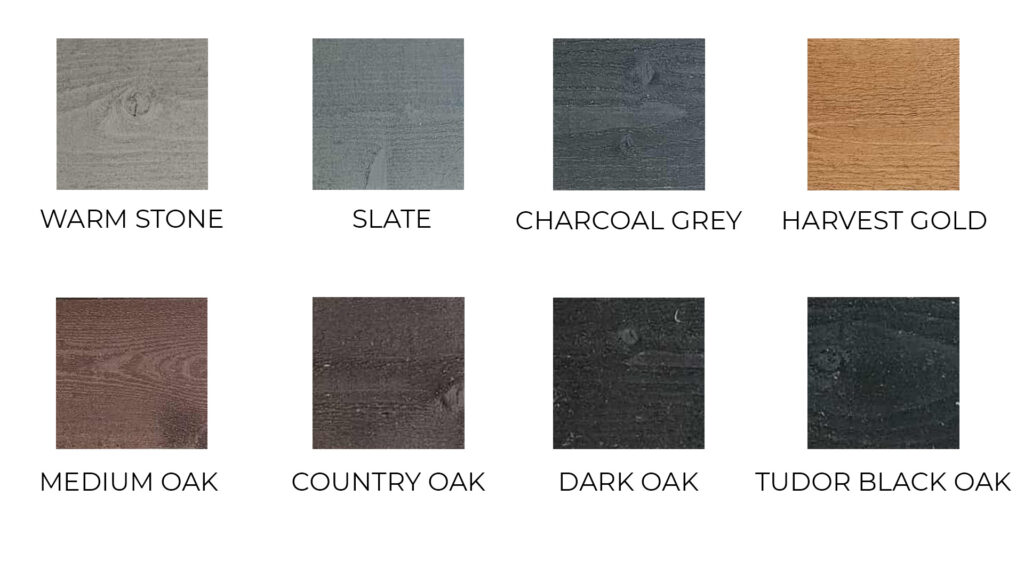 - Доступные цвета: SLATE, CHARCOAL GREY, HARVEST GOLD, MEDIUM OAK, COUNTRY OAK, DARK OAK, TUDOR BLACK OAK или индивидуальный цвет